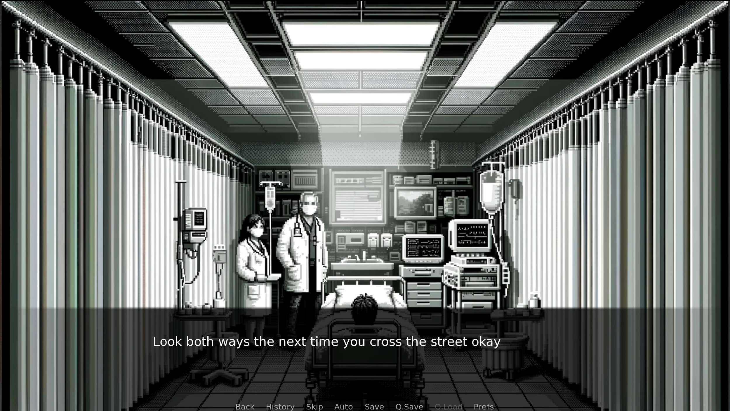 I hope the various color schemes, bleak pixelated backgrounds, and depressing sounds evoke a sense of despair in my players. Why should you care if you eventually die? I want my players to feel the futility of life. I believe that there is something more powerful to be said in stories that people can relate to: those that reflect the more common futility of daily life. And while this visual novel is not optimistic, it also lets the players know they are not alone. While it doesn’t make things much better, it does comfort the vast community of others who go through the same issues, knowing that the difficulties in their lives are not isolated.
